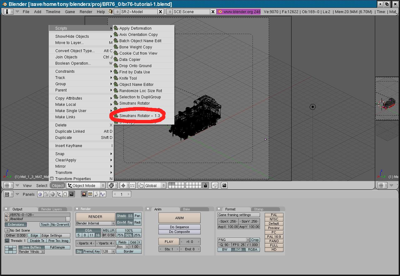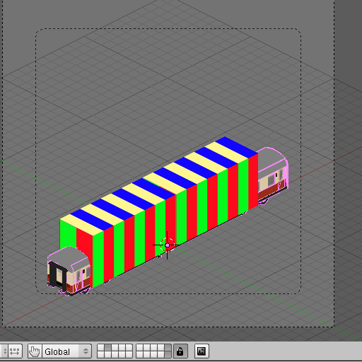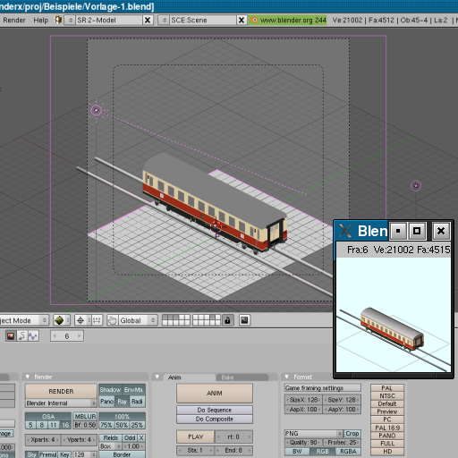 Falls jemand Interesse hat, kann ich meine Blender-Vorlage und eventuell zusätzliche Python-Programme zur Verfügung stellen. Damit kann man die Objekte in einem Rutsch in die entsprechenden Ansichten drehen. Hier sind ein paar Screenshots, den Prozess verdeutlichen. Ich habe es an einen IC-Wagen (beige-rot) verifiziert.