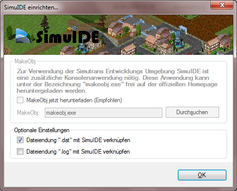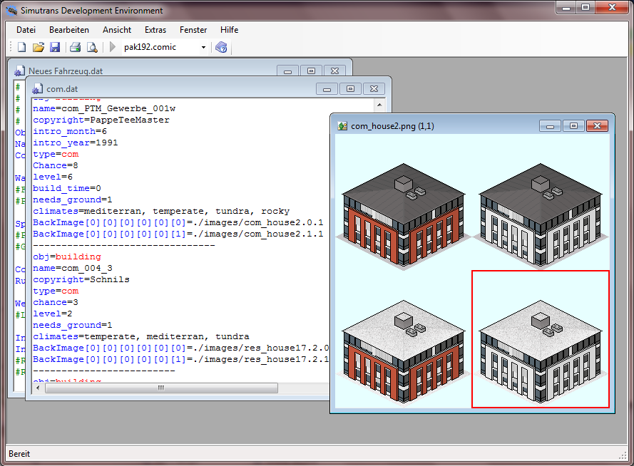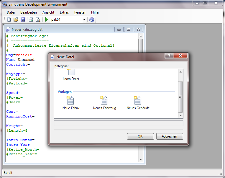 "Um ein Objekt für Simutrans aus einer *.dat-Datei zu erstellen, muss die *.dat nur in der IDE geladen werden, und der Menüpunkt "Erstellen" im Menü "Extras" gewählt werden."