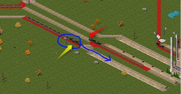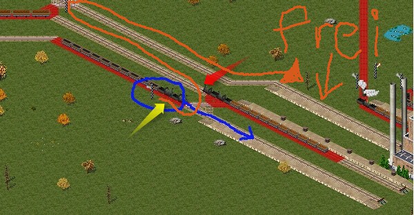 mir kommt gerade ein ähnliches Problem von mir in den Sinn, versuch mal das Signal an dem der Zug rechts oberhalb des blauen Pfeiles steht ein Feld nach rechts zu versetzen
