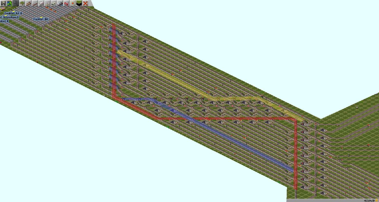 Liebe Simutrans-Spezialisten, bräuchte mal Eure Hilfe beim richtigen positionieren von Signalen. Ich komme einfach zu keiner vernünftigen Lösung. In meinem Beispiel sollen die Züge mit Hilfe eines Auswahlsignals auf einem der 11 Bahnsteige von Frankfurt Hbf einfahren. Dies tun sie auch, leider wählen sie fast immer die rot markierte Route und blockieren somit sämtliche Zufahrtsgleise für nachfolgende Züge. ( In ganz seltene Fällen habe ich auch beobachtet, das Züge eine ander Route wählen, die Alternativrouten scheinen also grundsätzlich zu funktionieren!)