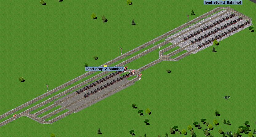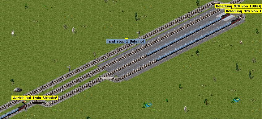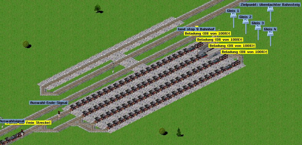 Hier noch als letzte Rückmeldung, warum für mich das Auswahlsignal so eine große Rolle spielt, wenn ich Güterbahnhöfe baue. Denn jetzt funktioniert es: Ich muss den Bahnhof nicht ewig breit bauen, um im Falle fehlender Güter alle Züge aufzunehmen: Sie landen jetzt in einer separaten Einfahrgruppe. Das Gleis 1 bleibt für Durchfahrten und Züge, die Güter anliefern ohne auf neue Güter zu warten, frei.
