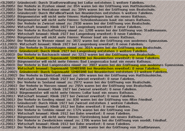 Wenn das jemand debuggen möchte, kann ich einen Spielstand ein paar Tage vor dem Wirtschaftswachstum anbieten. Bei drei Versuchen sind aber jedes Mal neue Gebäude (je einmal Tunnelbaustelle, Baustoffkontor und Tankstelle) entstanden.