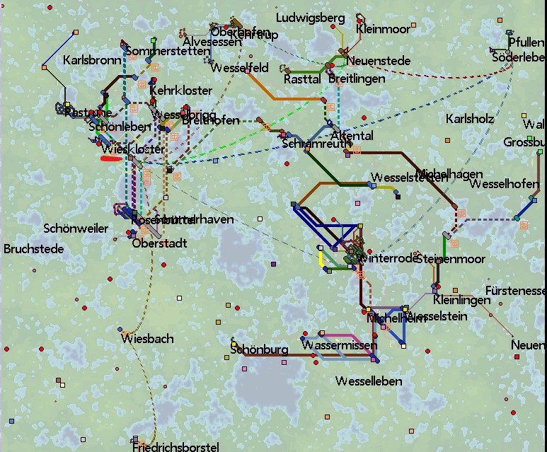Der verbindet über die Schiffslinien 3 Teilnetze miteinander. Und über die Fluglinien 3 weitere kleine Teilnetze. Dazu kommt die Anbindung der größten Stadt auf der Karte sowie 4 kleinerer Städte.