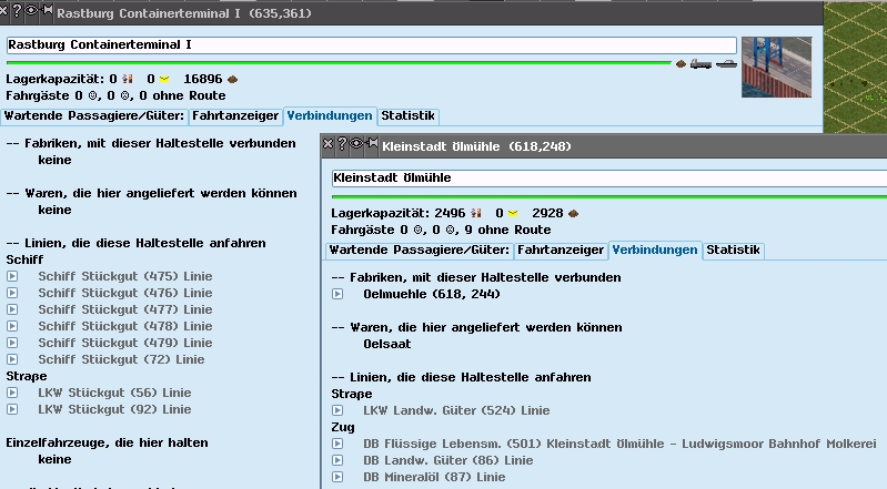 Ich suche immer noch eine Möglichkeit über meine Linien den Überblick zu behalten,. Besonders nervig finde ich, das ich im Stationsfenster im Tab "Verbindungen" nicht auf einen Blick sehen kann ob ich von dort schon eine Verbindung zu einer bestimmten Station habe.     Die Minimap mit dem Transportnetz hilft da auch nur bedingt, z.B. bei einer großen Karte mit vielen dicht nebeneinander liegenden Haltestellen.