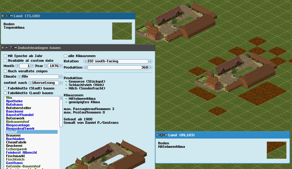 Mir ist gerade aufgefallen (r9741) das beim bauen einer Fabrik mit dem Karteneditor auf einer Klimazone die für die Fabrik nicht vorgesehen ist ("Alle Klimazonen" aktiviert), keine Felder erzeugt werden. Das ist unverständlich, zumal man wenn man die pak-Datei nicht selber erstellt hat gar nicht wissen kann ob eine Fabrik Felder hat wenn man sie nicht auf der richtigen Klimazone plaziert.