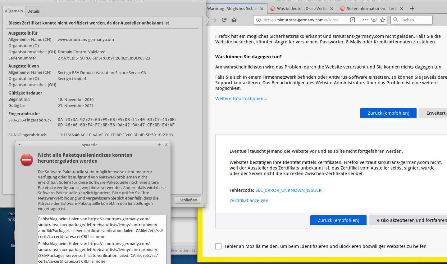 RE: Linux deb Packete/Repository - Andarix - 18-12-2019 Das Zertifikat ist gültig laut Testseite. Unter Windows wird es auch als gültig akzeptiert. Bei Linux scheint da ein Zertifikat zu fehlen, das Sectigo als gültige CA ausweist. Sectigo als CA scheint es erst seit Januar 2019 zu geben und zu Comodo zu gehören. Möglich das der Import des verlinkten Zertifikates von der folgenden Seite hilft. https://www.tbs-certificates.co.uk/FAQ/en/SectigoRSADomainValidationSecureServerCA.html |