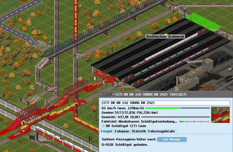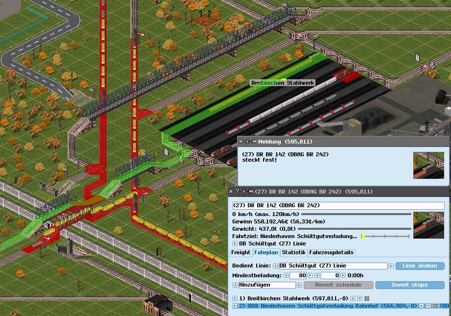 Wieder einmal Bahnhof mit Auswahlsignal - Geotrans - 24-04-2021 Ich verstehe nicht so recht warum dieser Bahnhof nicht funktioniert, Zug steckt jetzt zum zweiten mal fest. Eigentlich sollte er die grün markierte Route zurück fahren. Erst wenn ich oben die Verbindung kappe klappt es (grün markiert). Da heißt er wollte im Bahnhof drehen. Wie kann ich ihm das abgewöhnen (ohne Verbindung zu kappen)? RE: Wieder einmal Bahnhof mit Auswahlsignal - Andarix - 24-04-2021 Das rote Feld unter den Loks auf dem Bahnsteig in der Mitte irritiert mich. Hast Du mal mit dem Blocktool (Taste b) auf den blockierten Zug geklickt? RE: Wieder einmal Bahnhof mit Auswahlsignal - Geotrans - 24-04-2021 Das rote Feld ist der eigentliche Haltepunkt des Zuges und wird angezeigt da der Fahrplan offen ist. Da mit dem Blocktool hatte auch nicht weitergeholfen, deshalb habe ich dann die Verbindung gekappt. RE: Wieder einmal Bahnhof mit Auswahlsignal - Zugfahrer - 24-04-2021 Ist der Zielbahnhof eingleisig? Dann würde das Auswahlsignal für den Rückweg stören. Ich nutze immer getrennte Ein- und Ausfahrten für die Bahnhöfe, dann wirkt das Auswahlsignal nur für die Einfahrt an dem betreffenden Bahnhof. RE: Wieder einmal Bahnhof mit Auswahlsignal - Geotrans - 25-04-2021 (24-04-2021, Saturday-22:35:07 )Zugfahrer schrieb: Ist der Zielbahnhof eingleisig?Nein ist auch mehrgleisig. RE: Wieder einmal Bahnhof mit Auswahlsignal - Andarix - 25-04-2021 Die Anlage des Bahnhofs erscheint mir auch etwas zu komplex. Ich weis nicht, welche Richtungen erwünscht sind. Bei der Karte die Du mir mal geschickt hast ist der noch nicht so ausgebaut. Hier würde ich die Fahrplanhalte an die Außenseiten setzen und den Bahnsteig in der Mitte entfernen. Oder zumindest kürzen damit der frei bleibt. Die Routensuche geht in Fahrtrichtung weiter und versucht dann durch das mittlere Gleis gerade auf das Ausfahrgleis zu kommen. Das ist eine gültige Route, auch wenn das Gleis besetzt ist. Der Zug dreht nur um, wenn in Fahrtrichtung kein Weg gefunden wird. Hier steht das Signal an dem der Zug wartet auch falsch. Das gehört ans andere Ende der Strecke. RE: Wieder einmal Bahnhof mit Auswahlsignal - Geotrans - 25-04-2021 (25-04-2021, Sunday-12:16:10 )Andarix schrieb: Die Anlage des Bahnhofs erscheint mir auch etwas zu komplex.Der Bahnhof wird jezt von zwei Seiten angefahren, allerdings habe ich die eine Einfahrt über einen kleinen Umwege geleitet damit er nicht als Durchfahrt genutzt wird. (25-04-2021, Sunday-12:16:10 )Andarix schrieb: Hier würde ich die Fahrplanhalte an die Außenseiten setzen und den Bahnsteig in der Mitte entfernen. Oder zumindest kürzen damit der frei bleibt.Wie kann ich den sicher sein das dann auch das mittlere Gleis genutzt wird? (25-04-2021, Sunday-12:16:10 )Andarix schrieb: Der Zug dreht nur um, wenn in Fahrtrichtung kein Weg gefunden wird.War das schon immer so oder hat sich das geändert? Gibt es einen Parameter der das beeinflusst? (25-04-2021, Sunday-12:16:10 )Andarix schrieb: Hier steht das Signal an dem der Zug wartet auch falsch. Das gehört ans andere Ende der Strecke.Da hatte ich wohl auch noch einen Denkfehler, ich denke optimal ist nicht Ende der Strecke (ich denke damit ist vor der nächsten Kreuzung gemeint), sondern so das der längste den Bahnhof anfahrende Zug diesen vollständig verlassen kann. Denn dann wir das Einfahrtgleis solange nicht blockiert bis der Zug auch wirklich voll ausfahren kann. Den Fehler habe ich leider noch häufiger auf meiner Karte... Auch hier wieder ganz herzlichen Dank für Deine Unterstützung!!! RE: Wieder einmal Bahnhof mit Auswahlsignal - Geotrans - 26-04-2021 Hätte ich so auch nicht erwartet, ich dachte die Lok würde auf dem Haltepunkt halten und nicht der letzte Waggon. Da werde ich meine Güterbahnhöfe wohl noch mal massiv umbauen müssen. sehr kreative Wegfindung: der mutige Brückensprung ist denke ich meinen Umbauarbeiten geschuldet. Witzig finde ich nur, das er das neue Gleis schon für seine Routensuche nutzt. RE: Wieder einmal Bahnhof mit Auswahlsignal - prissi - 27-04-2021 Wenn die Route feststeht, dann geht es von eienm Feld zum anderen, wenn die Richtung stimmt. Es wird erst neu gerechnet, wenn man an Felder wie Endstuecke kommt. Mit etwas Aufwand kann man so auch einmalig einen Zug unter die Berge beamen. RE: Wieder einmal Bahnhof mit Auswahlsignal - Altix - 29-04-2021 Dass ein Zug von der Brücke fällt, passiert mir eigentlich sehr oft - immer dann, wenn ich in eine bestehende Strecke eine Brücke einbaue - z.B. wenn ich bei einer Kreuzung ein Gleis auf eine Brück verlege, um Staus an der Kreuzung zu vermeiden. |