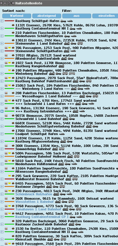 Übersichtlichkeit von Haltestellenlisten usw. - Geotrans - 13-05-2021 Mag an meinen Augen liegen, aber ich finde es sehr anstrengen z.B. in einer langen Haltestellenliste einen Ort zu finden. Am schönsten fände ich wenn die Haltestellennamen farblich abgesetzt wären, alternativ könnte ich mir auch vorstellen falls das nicht umsetzbar ist, vor und nach die Haltestellennamen jeweils *** oder --- zu setzen. RE: Übersichtlichkeit von Haltestellenlisten usw. - Andarix - 13-05-2021 Über die Optionen lässt sich nach Name filtern. Das geht auch mit Wortteilen. Leider nicht live, sondern man muss nach Änderung der Eingabe den Filter immer wieder deaktivieren und aktivieren. Früher war zwischen den einzelnen Halten auch mal etwas Platz. Das ist aber vor einiger Zeit bei einem Fix auf der Strecke geblieben. RE: Übersichtlichkeit von Haltestellenlisten usw. - prissi - 14-05-2021 Leider sind alle Listenoptionen irgendwie in drei Design gefangen. Die moderneren haben direkt ein Namensfeld, was m.E. die beste Lösung ist. Aber wie Frank gesagt hat, man kann nach Namesbestandteilen filtern . RE: Übersichtlichkeit von Haltestellenlisten usw. - Geotrans - 14-05-2021 (14-05-2021, Friday-03:06:01 )prissi schrieb: Die moderneren haben direkt ein Namensfeld Wo kann man das sehen? Ich habe dazu in den verschiedenen Themen bisher keinen Unterschied feststellen können und / oder noch nicht verstanden was mit "Namensfeld" gemeint ist. RE: Übersichtlichkeit von Haltestellenlisten usw. - Andarix - 14-05-2021 wobei die modernen (die direkt im Fenster) live funktionieren alt neu Wobei gerade auffällt, das die Beschriftungen nicht stimmig sind, oder die verwendeten Übersetzungen veraltet sind. Besser es gibt gar keine Beschriftung für das Filterfeld. Daher vermutlich die Irritation. Da wünscht man sich manchmal Trennlinien, die die Fensterbereiche optisch trennen. RE: Übersichtlichkeit von Haltestellenlisten usw. - Geotrans - 16-05-2021 (14-05-2021, Friday-14:53:10 )Andarix schrieb: wobei die modernen (die direkt im Fenster) live funktionieren Danke! Jetzt habe ich es verstanden. Den Filter nutze ich eher selten, wenn ich genau weiß welchen Ort ich suche springe ich über die Minimap dort hin. Was nicht heißt das der Filter nicht durchaus sinnvoll ist, wenn man z.B. alle Haltestellen einer Stadt will. Die Haltestellenliste durchsuche ich meist wenn ich bei einer Fabrik angezeigt bekomme das jede Menge Ware unterwegs ist, aber nichts auf Lager. Hier habe ich noch keinen Filter gefunden, nach dem ich alle Haltestellen filtern kann, wo Ware für eine bestimmte Fabrik lagert. RE: Übersichtlichkeit von Haltestellenlisten usw. - Dwachs2 - 20-05-2021 @Geotrans: in deinem screenshot sind auch die Zeilenabstaend 'falsch': Vor dem Namen kleiner als danach, sollte eigentlich andersrum sein :/ RE: Übersichtlichkeit von Haltestellenlisten usw. - Geotrans - 21-05-2021 (20-05-2021, Thursday-14:58:47 )Dwachs2 schrieb: @Geotrans: in deinem screenshot sind auch die Zeilenabstaend 'falsch': Vor dem Namen kleiner als danach, sollte eigentlich andersrum sein :/ habe mir das full package r9794 runtergeladen und alle Dateien überschrieben. Trotzdem habe ich in allen Themen die falschen Zeilenabstände. Ist das nur bei mir so? Oder wo wird das eingestellt? RE: Übersichtlichkeit von Haltestellenlisten usw. - prissi - 21-05-2021 Was fuer einen Zeichensatz hast du ausgewaehlt und ist das Linux oder Windows? AUch koennen manche Parameter in der Simuconf.tab vom pak das GUI ueberschreiben. RE: Übersichtlichkeit von Haltestellenlisten usw. - Geotrans - 21-05-2021 (21-05-2021, Friday-15:31:09 ).prissi schrieb: Was fuer einen Zeichensatz hast du ausgewaehlt und ist das Linux oder Windows? opensuse Leap 15.1 Egal welchen Zeichensatz ich auswähle die verdrehten Abstände bleiben. Habe probehalber die Simuconf.tab vom pak durch die von r9794 ersetzt, gleiches Ergebnis |