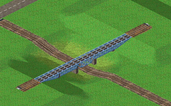 2) Kreuzung auf flacher Ebene. Da die Brücke nur ein halbes Tile hoch ist geht das nicht mehr einfach so, man muss sich eine passende Rampe manuell basteln, mindestens auf halbe Höhe. Das ist zwar im Vergleich dazu, wie man Simutrans früher spielte, etwas ungewohnt - aber wo findet man denn bitte in Natura Brücken mit einer steilen auf- und abfahrt, bei der nicht Erde drunter ist sondern ein Baugerüst? Genau genommen ist da eher die Brückenrampe an sich das seltsame Konzept, nicht die manuelle Aufschüttung. Zudem: selbst wenn es solche steilen Brückenauffahrten noch gäbe, wären diese vergleichbar mit 90°-Kurven. Will man sinnvoll bauen würde man sie also sowieso vermeiden (außer, man baut auch sonst nur im Rechtecksmuster)