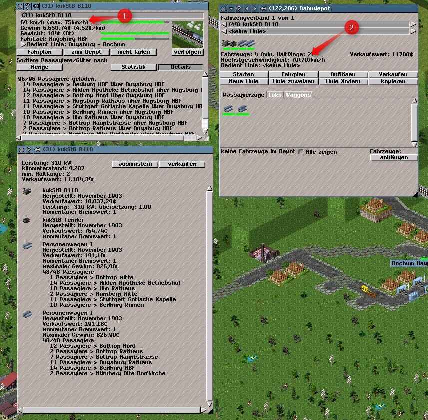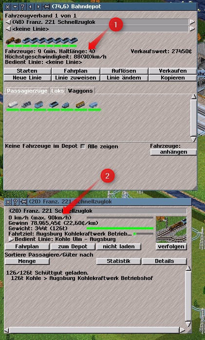 Die Geschwindigkeitsangaben für Konvois im Depot bezieht sich jeweils auf das leichteste bzw. das schwerste Gut, das transportiert werden kann. Beide Angaben gelten jeweils für einen voll beladenen Zug.