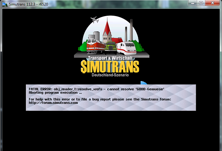 vielleicht erreiche ich noch jemanden in diesem alten Thema... Auf jeden Fall möchte ich mich erstmal bei GEOTRANS für seine Addons danken. Hat sich ja nicht von alleine programmiert. Also vielen Dank! Ich habe ein kleines Problem mit deinen Addons bzw. auch nur mit einem, aber nachdem ich die Dateien von deiner Seite geladen habe startet mein Simutrans nicht mehr, wenn ich pak.german mit addons laden möchte. Ich bekomme immer die angehöngte Fehelrmeldung. In dem anderen Simutransfenster steht, dass bei vielen Dateien von dir ein "unexpected end of file after 268/264/241 bytes while reading addons/pak64.german/goo.Leerpaletten.pak" aufgetreten ist. Das steht dort für mehrer Dateien: Containertrailer.pak Zuckerruebenfeld.pak Zuckerruebenhof.pak Zuckerraffinerie.pak GetreidemühleForstner.pak Speicherhaus.pak Ich habe immer nur die pak.Dateien runtergeladen. Brauche ich die anderen auch oder liegt das an was anderem? Bei meinen restlichen addons habe ich auch immer nur die .pak. Viele Grüße