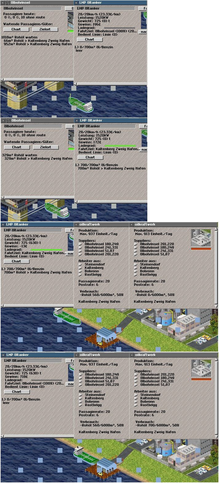 Bild 3: Der Tanker steuert den Zielhafen an. Ein Kraftwerk hat noch einen Vorrat von 568, das andere ist noch leer (von wegen überfüllt....)