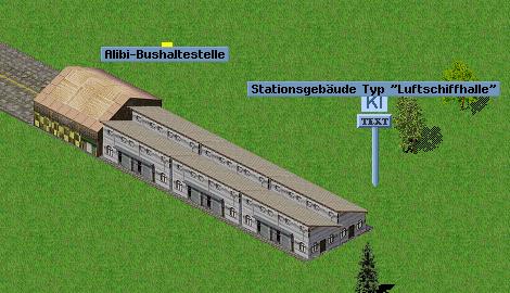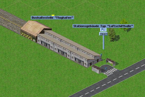 Funktional klappt das zwar nur mit einem Trick, aber schließlich ist ja alles nur ein Spiel. Das Prinzip hier mit Hilfe eines Flughafen-Depots und Flughafenstationsgebäuden demonstriert: Zuerst werden neben den geplanten Stationsgebäuden (also die Verlängerung des Luftschiffdepots) drei Bushaltestellen auf einer kurzen Straße gebaut. Dann werden die Flughafenstationsgebäude daneben gesetzt. Dies wären jetzt aber (Trick Nummer 1), anreihbare Gebäude für den Luftschiffhangar. Stehen diese nun, können (Trick Nummer 2) die Bushaltestellen nebst Straßenstück wieder abgerissen werden. Und zum Abschluß spendiert man den Fluggästen eine richtige Haltestelle an passender Stelle. --- Es geht auch schneller, wenn man den abschließneden Bushalt zuerst baut. Stationsgebäude sind Stationsgebäude. Egal ob für Bus oder Luftschiff.