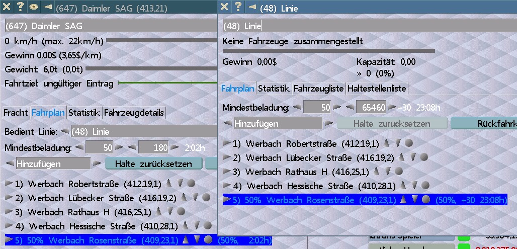 Neu erstellter Bus mit Fahrplan (Bild links). Daraus dann eine neue Linie erstellt (Bild rechts)