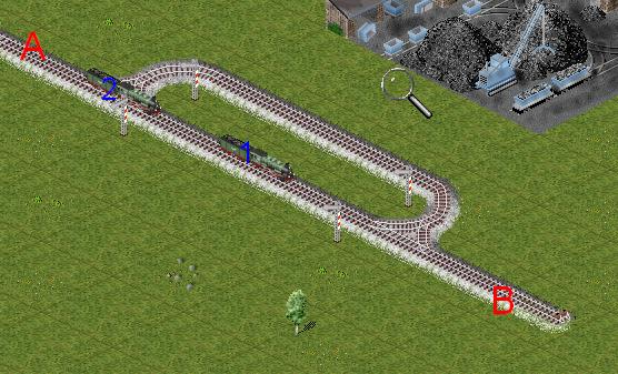 Siehe Screenshot 1: Zug 2 will nach B. Jedoch ist der kürzeste Weg zufällig besetzt (durch Zug 1). Gibts ne Möglichkeit, dass Zug 2 dann automatisch auf das Nebengleis wechselt und das besetzte Gleis umfährt (also ohne Hilfe von zusätzlichen Wegpunkten)? Sonst bleibt er ja dort (wo er gerade steht) stehen.