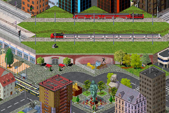 Jetzt hab ich endlich mal wieder etwas Zeit gehabt um ein wenig neue Sachen zu bauen. Ich hab mich mal an ein paar "Platzhaltern" versucht, die als Bahnhofserweiterung gebaut werden können. Diese übermalen die Fundament-Slopes im Pak128, die sonst eher gerade bei hochgebauten diagonalen Strecken nicht gerade schön aussehen. Mit den "Platzhaltern" sieht die Strecke jetzt vielleicht im entferntesten an die Stadtbahnviadukte in Berlin aus.. Naja vielleicht..