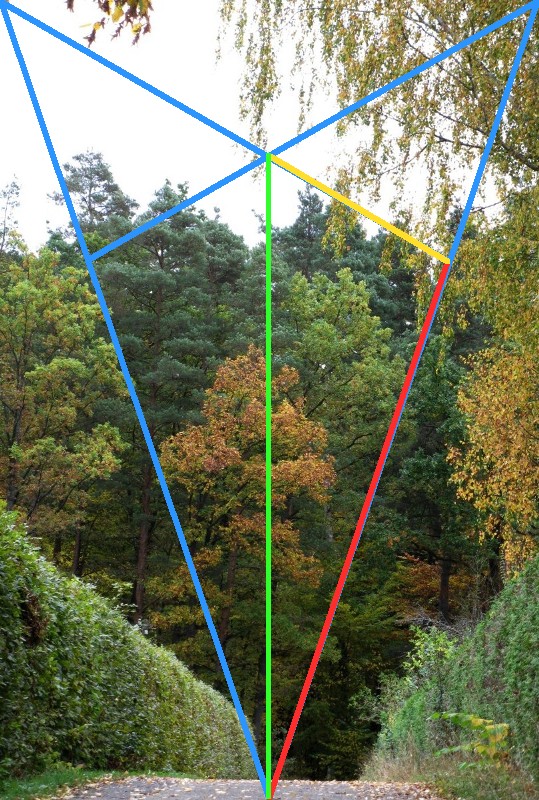 Leider sind dort keine Wolken auf blauen Hintergrund.Danach habe ich das Bild so ungefähr mit dem Goldenen Dreieck "zerschnitten" und musste festellen, dass das Bild schon fast perfekt ist. Es fehlen wirklich nur ein paar Meter mehr Luftlinie und schon wären die Bäume oben im Schnittpunkt und nicht mehr der Himmel.