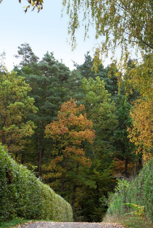1. Der Betrachter würde wahrscheinlich dem Weg zum dunkeln Punkt, hinterm Weg, folgen. Er würde sich fragen, wo geht der Weg hin. Danach fällt der schon gefärbte Baum ins Auge (leicht links). So wie jetzt auch schon. Nur der Anfangspunkt des Betrachters fehlt. Also der Weg.