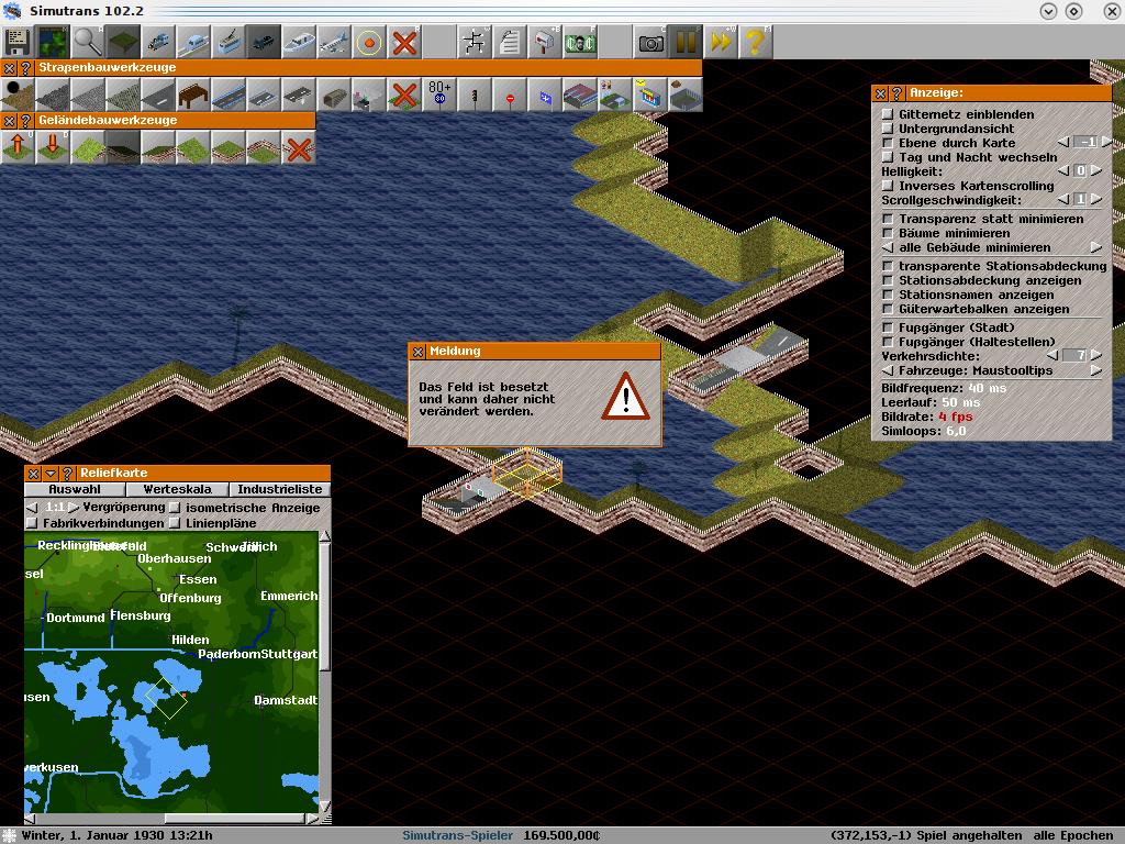 auf der Suche nach Möglichkeiten, meine Streckenbaustrategien noch ein wenig zu verbessern, bin ich unter anderem auf folgenden Wiki-Artikel gestoßen: Tunnel unter Wasser bauen. Leider habe ich das bisher noch nicht hinbekommen. Beim Schritt des absenken des Tunnels kommt immer die Fehlermeldung "Dieses Feld ist besetzt und kann daher nicht verändert werden". Die Voraussetzungen müsste ich eigentlich erfüllen (Simutrans 102.2). Ich habe es mit pak (64) und pak.german und nun auch der neuen Version von pak (64) - die alte habe ich einfach in pak.old umbenannt - ausprobiert - ohne Erfolg. Woran liegt dieses Verhalten?