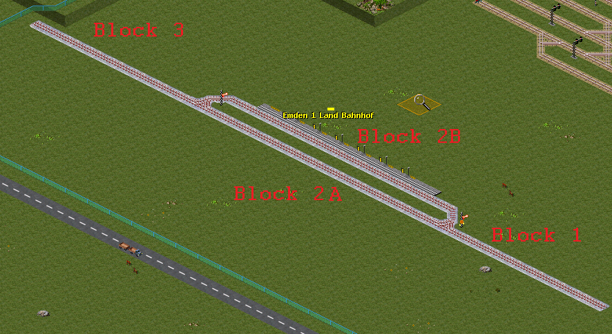 Wenn ein Zug von rechts in Block 1 herein fährt befindet sich dort, wo jetzt das Zweiblocksignal steht dein Zug herein. Wenn jetzt vorher ein Zug aus Block 2B ausfährt und Block 3 belegt, soll der Zug nicht in Block 1 stehen bleiben, sondern in Block 2A vorfahren. Wenn aber Block 3 frei ist, soll gleich über Block 2A die Strecke bis in Block 3 reserviert werden, gleichwertig wie ein Zweiblocksignal, weshalb in der Folge der andere Zug in Block 2B verweilen muss, bis Block 3 wieder frei ist.