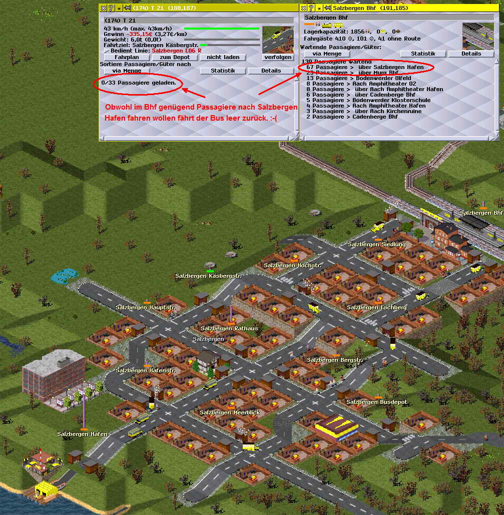 genau der Meinung bin ich ja auch, deshalb verwundert es mich ja so das meine Schiffe leer durch die Gegend gondeln und nur Minus produzieren. ?(Ich kann den "Fehler" jetzt auch bei der Busverbindung nachweisen. Die habe ich jetzt neu eingerichtet, weil ich dachte das Problem damit wenigstens Teilweise in den Griff zu kriegen. Aber Pustekuchen, die Busse fahren auch leer vom Bhf zum Hafen obwohl nachweislich einige Passagiere diese Route benutzen wollen. X(