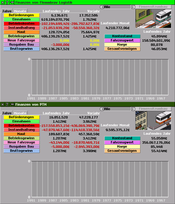 hier mal die finanzfenster von flemmbrav und mir, den beiden finanzstärksten spielern auf der map