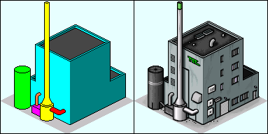 Das Logo ist etwas knallig, weil es eine Leuchtfarbe benutzt. Das geht leider nicht anders (es sei denn, man ändert generell die Leuchtfarben des Grafiksets (geht doch mittlerweile, oder?)). Klar könnte man den Schornstein oben auch rot gestalten. Aber das Grün passt doch prima zum Logo. Und da der Schornstein jetzt nicht sooo hoch ist, muss er nicht sonderlich markiert werden, finde ich. Das spielt bei Kraftwerken eine größere Rolle.