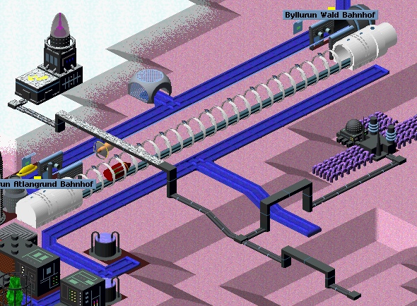 In Simutrans sind Stromleitungen als Oberleitungen konzipiert, und deshalb können sie Verkehrswege oder Flüsse kreuzen, ohne daß man eine Brücke oder eine Kreuzung dafür braucht, die Fahrzeuge fahren einfach drunter durch. Bei mir ist die Stromleitung jedoch ein Kabel, das auf dem Boden liegt, und da sieht das natürlich blöd aus (Anhang 1).