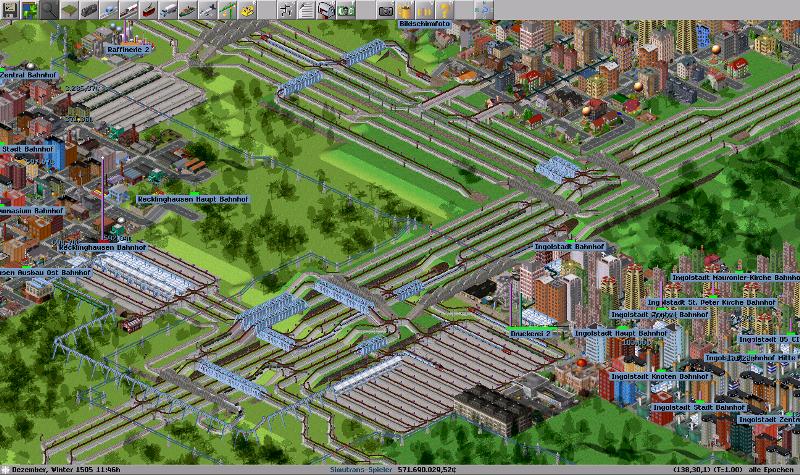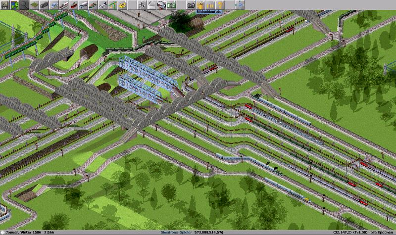Hier hab ich mal meinen größten Güterbahnhof auf der Karte hochgeladen. Zu meiner Schande hab ich den noch nicht geschafft als Durchgangsbahnhof zu konzipieren und auf den östlichen Bahnhofsteilen ist auch erstaunlich wenig los..