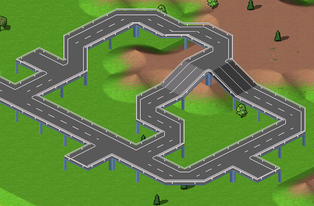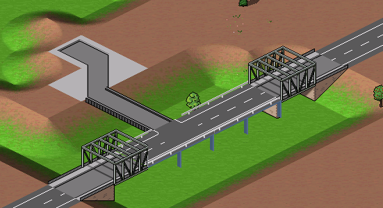 Wenn die Hochstraße im "Tal" liegt, funktioniert Deine Variante der Verbindung, mit einer Brücke. Auf der Ebene ist es mir nicht gelungen, mit einer Brücke den Anschluß zu bauen, nur mit einer anderen Straße.