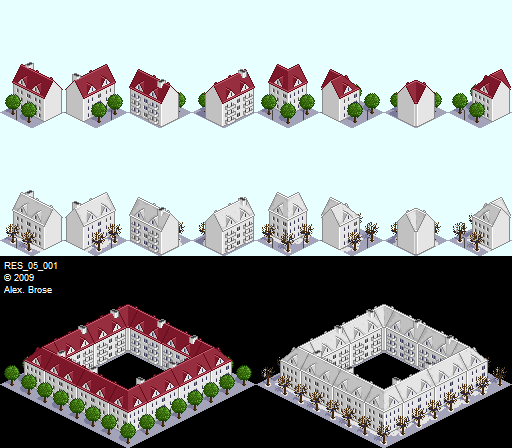 EDIT: Und ein vierfach rotierbares Einzelgebäude. Theoretisch könnte man auch hier noch Eckgebäude definieren. Z.B. als Garten. Eckgrafik bleibt ja Eckgrafik beim Rotieren. ...Hab mal ein wenig auf der externen Festplatte rumgewühlt.