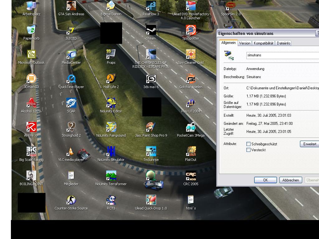 Du hast die simutrans.exe auf den Desktop kopiert. Das war nicht der Sinn der Übung. Oder startest du so das Spiel? Normalerweise liegt die simutrans.exe im Verzeichnis \Simutrans. Wo auch immer sie liegt, schnapp sie dir mit der rechts dauergedrückten Maustaste. Zieh sie auf den Desktop. Jetzt Maustaste loslassen, geh in die Eigenschaften.