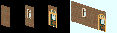 Das angehängte Bild soll das Prinzip verdeutlichen. Fenster und Türen gibt es einzeln, man kann sie mit jeder Wandsorte kombinieren. Damit ist es möglich mit relativ wenig Bildern für eine ganz nette Vielfalt zu sorgen.