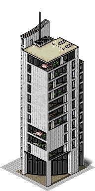 Gehen wir also direkt zum "Wie" über. Das wichtigste zuerst - Kantenglättung. Beim setzen deiner Konturen hast du nicht bloß schwarze Pixel erzeugt, sondern auch 'grau', bzw. halbtransparentes Schwarz, welches sich mit dem hellblauen Hintergrund vermischt hat. Das ist der Grund, warum dein Gebäude in der früheren Version im Spiel eine bläuliche Aura hatte - das dürftest du ja gemerkt haben, denn diese Außenpixel hast gesäubert. Geblieben ist jedoch, dass viele deiner Konturen kein echtes Schwarz sind, also #000000. Sieht man sehr schön, wenn man schwarz durch allseits beliebtes quietschpink ersetzt: Eigentlich sollte in so einem Fall auch wirklich alles an Konturen erfasst sein. Ein Beispiel, wie es aussehen sollte: Das ist üblicherweise auf die Werkzeugeinstellungen zurückzuführen. Ich habe GIMP nicht installiert - aber suche bei dem Werkzeug, das du für die Linien verwendet hast, nach einem Eintrag "Weiche Kanten", "Kantenglättung" oder "Anti-Aliasing" und deaktiviere es. Dann werden keine Mischfarben mehr erzeugt, sondern nur noch verwendet, was in der Farbpalette ist. Dadurch kann auch zB. das Füllwerkzeug sinnvoller angewendet werden. Kantenglättung beim Pixeln gibt es aber auch - nur wird diese zumeist manuell gemacht. Eine Farbfläche, welche von einer diagonalen Kontur abgeschlossen wird, sollte stehts eine dunklere Version der Farbe direkt an den Kanten genutzt werden. Zugegeben - da bin ich selber etwas muffelig, diese Glättung immer anzuwenden. Dafür ist Alex um so tüchtiger - Betrachte die Übergänge zwischen Konturen und den Flächen, direkt an den Konturen sind dunklere Pixel. Das Resultat davon ist, dass die Konturen glatter und etwas fester wirken. Ich mache das inzwischen übrigens so, dass ich ziemlich ohne Kantenglättung arbeite und als einen der letzten Arbeitsschritte 50% transparentes Schwarz in einer neuen Ebene nutze, um die ganzen Kanten nochmal nachzuzeichnen. Damit dauert es nicht allzulange. (Ja, dieses Beispiel nutzt transparenten Hintergrund. Ist recht neu, dass das möglich ist - somit kann auch die Außenkante geglättet werden.) Es ist auch zu beachten, dass die Konturen nur einen Pixel breit sind. Das gilt auch für diagonale Linien - bei diesen sollten Pixel auch wirklich nur diagonal verbunden sein, und keinen Treppeneffekt erzeugen. Nutzt man ein Linien-Werkzeug (zB. auch den Stift mit... Strg-Click? Shift-Click? Ich weiß nicht mehr, wie der Stift in Gimp automatisch Linien zieht) so erzeugen die meisten Programme bereits das richtige Ergebnis. Beim Freihandzeichnen hingegen sind Pixel generell immer an den Seitenflächen verbunden, und müssten entsprechend nachkorrigiert werden. Das erklärt, warum dein Schnee so extrem breite Konturen hat - der wurde natürlich frei Hand gezeichnet und nichts nachgebessert. Eine ausführlichere Erklärung zum Thema Outline findet sich zB. hier: http://samkeddy.com/pixel-art-outlines/ Natürlich kommts auch drauf an, WO die Outlines angebracht werden. Ein sehr schweres Thema, da bin ich selbst noch oft überfragt. Aber von deinem Foto ausgehend, würde ich wahrscheinlich versuchen auch die Seiten mit Konturen für die weiß-grauen Unterteilungen zu versehen. Das würde vermutlich dazu führen, dass ich die weiß-graue Unterteilung selbst nur einen Pixel breit hätte, und statt 11 Fassadenteile nur 10 Platz fänden, wobei auch noch die Gesamtbreite des Gebäudes geändert werden müsste, damit alles gleichmäßig ist. Ein riesen Haufen Arbeit - ich kann nicht mal zuversichtlich sagen, dass es sich auszahlen würde. Nur, dass ich es machen würde, wäre es mein Gebäude. Weniger wichtig, aber es fällt eben auf, ist die Flächenfüllung. Am Dach, egal ob beschneit oder nicht, wurde versucht, eintönige Flächen zu vermeiden - was generell ganz gut ist. Verwendet wurden dazu jedoch ein paar handgezeichnete Linien - und das geht besser. Insbesondere sollte man sich immer in Erinnerung rufen, dass man flächig arbeiten kann und nicht auf Linien angewiesen ist. Erneut kommt da Alex' Hochhaus gelegen - die Dachfläche besteht nur aus drei leicht unterschiedlichen Farbtönen, welche flächig aufgetragen sind - mit dem dunkelsten außen (Anti-Aliasing nicht mit eingerechnet, sonst wären es fünf Farbtöne). Um sowas nachzupixeln, einfach das gesamte Dach mit der dunkelsten Farbe füllen, dann eine hellere nehmen und deren Außengrenze ziehen und die Mitte füllen. Dann nochmal etwas weiter innen mit der hellsten Farbe. Davon abgesehen können auch sehr regelmäßige Muster helfen, die Monotonie einer einfarbigen Fläche zu durchbrechen, wie an den Wänden von Alex' Hochhaus zu sehen. Ich habe mir da quasi schon eine Füllmusterbibliothek zugelegt. Ich denke, damit habe ich erstmal genug Input gegeben, und ich erwarte auch nicht, dass das alles an diesem Objekt nochmal geändert wird. Sinnvoller ist es da, gleich mit dem nächsten weiterzumachen, besser zu werden, und irgendwann später zurückzukehren, wenn man selbst nicht mehr zufrieden ist. Über mehrere Iterationen können sich Gebäude drastisch verbessern (dieses war Original nicht von mir, ich hatte schonmal versucht, es etwas zu verbessern, und vor kurzem dann nochmal aktualisiert):