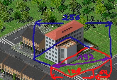 Das Hotel habe ich auf den Roten Bereich ausgelegt gehabt. Dieser hat nach meinen Berechnungen eine x-Ausdehnung von 192 Pixeln (128+64). Sollte allerdings kein Problem sein, das Hotel auf den Roten+Blauen Bereich auszudehnen der dann 256 Pixel breit ist. Die Raffinerie ist von der Größe her auf diese (Rot+Blau) bereits ausgelegt. Wenn ich hier falsch liege bitte nochmal kurze bildliche Erklärung - bin da ein visueller Typ Big Grin Und natürlich noch Entschuldigung für das schnelle reinschmieren in die schöne Simutanien-Postkarte Wink