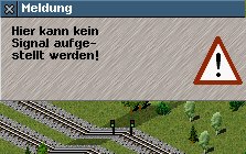 Schon wäre es, wenn an dieser Stelle ein Signal gebaut werden könnte; das funktioniert übrigens auch nicht, wenn das Gleis horizontal auf einer Brücke weitergeführt wird. Genausowenig hilft die Ctrl-Taste; der Cursor ist irgendwie immer auf der falschen Ebene.