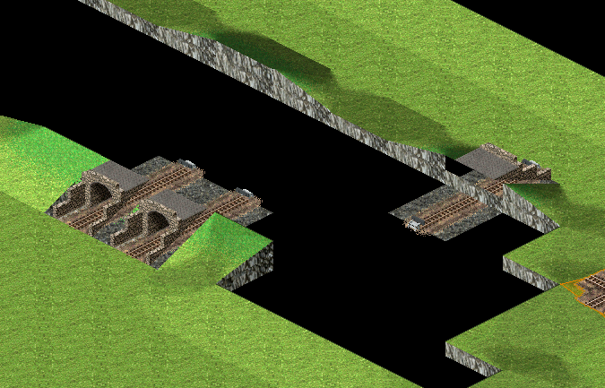 Auf dem Screenshot ist links eine Geländestufe mit halber Höhe zu sehen, der Tunnelbau funktioniert dort nicht, da das Gelände zu flach ist. Da muß das Gelände um eine wietere halbe Stufe angehoben werden. Recht ist der bereits gebaute Tunnel zu sehen.