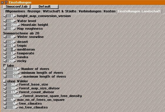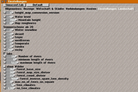 prissi,'index.php?page=Thread&postID=112806#post112806' schrieb:Das muss mal aufgeraeumt werden. Die beiden Dialoge zeigen den gelciehn Wert, allerdings aendert der einen den ohne den anderen zu informieren. Das Problem ist, dass keinen Klimazonen zwischen -9 und -2 ist. Daher fuellt Simutrans alles mit Wasser. Insofern ist der Waterlevel-Parameter eigentlich ueberfluessig, denn der ergibt sich ja automatisch aus der niedrigsten Klimazone. Muss die Tehorie aber noch mehr testen, konnte nur kurz auf den Code schauen. ...