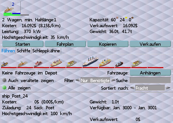 (14-01-2021, Thursday-15:52:10 )prissi schrieb: .... Ich würde vorschlagen ein unsichtbares Fahrzeug mit dem Rest>16 16 automatisch dazuzukuppeln. Das ist bei weitem die einfachste Lösung. Was die Liste der vorhandenen Fahrzeuge zerschießt. Bei Fahrzeugen ohne Grafik kann keine Breite ermittelt werden und die Liste wird immens breit. Zweiter Nachteil, wenn Einführung nach Ausführung liegt wird das in der Reihung blau angezeigt. Blau wird auch angezeigt, wenn die Einführung in der Zukunft liegt. Die Zusatzpost bei den Schiffen im pak64.german ist auf Einführung 3000 und Ausführung 3001 datiert. Wird aber in der Zusammenstellung blau angezeigt.