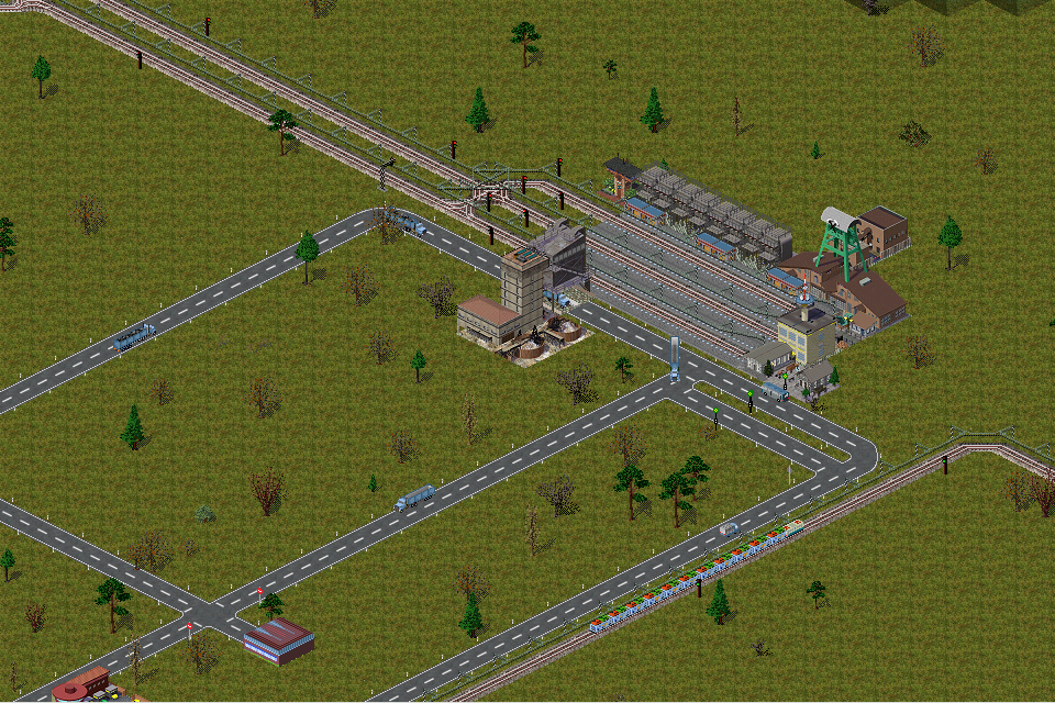 Ein Kohlebergwerk und ein Erzbergwerk mit passenden Lagergebäuden. Gleichzeitig kommen von einem entfernten Bergwerk noch LKW´s an, um ihre wertvolle Fracht am Industrie-Bhf zu entladen. Die Straße unter dem Kohlebunker ist eine reine Durchfahrtsstrasse, d.h. von links beladen rein und rechts leer wieder raus. Die Schüttgutzüge sind im Dauereinsatz, da in den Kohlelagern genug gebunkert wird um die Züge auch mit 100% Ladung zu befüllen.
