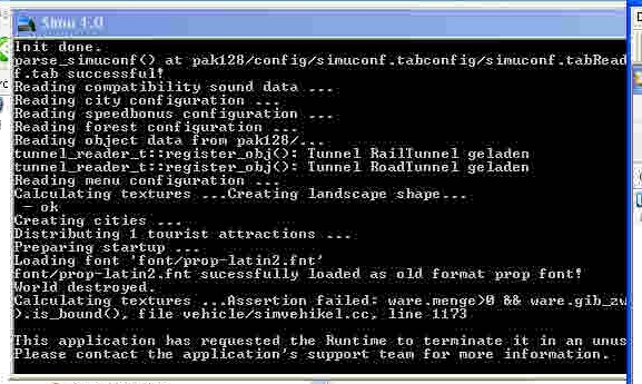 Das Programm wird abrupt geschlossen. Reproduzierbar passiert das immer zur gleichen Uhrzeit (Bei mir stürzte das Spiel immer um 1:36h ab). Wahrscheinlich passiert das bei der Abfahrt eines Fahrzeugs, der Absturz hat etwas mit der Beladung des Fahrzeugs zu tun.