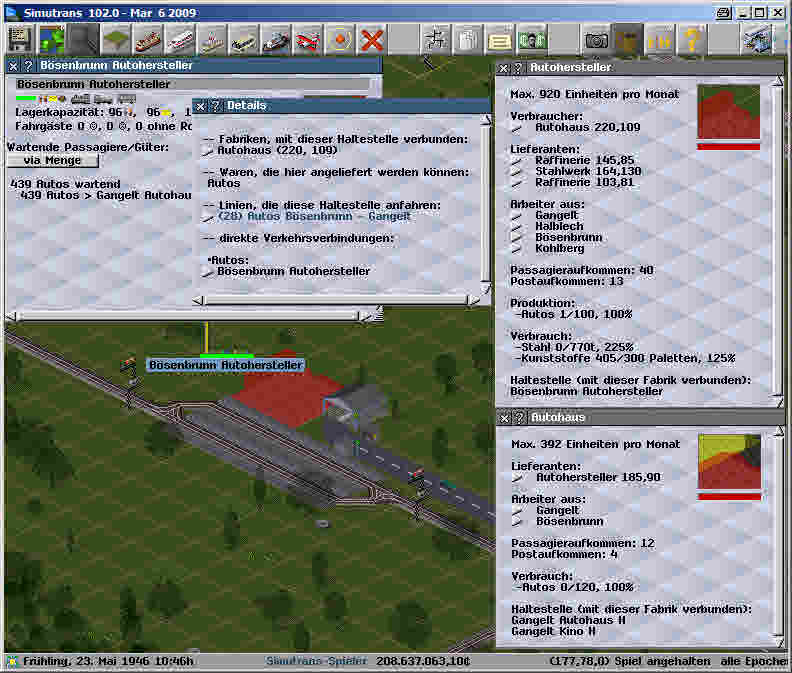 Es liegt direkt auf der benachbarten Kachel. In den Details ist auch vermerkt, dass Autos von diesem Autohersteller angeliefert werden können. Und laut Infofenster des Autohauses ist die Haltestelle (derselbe Frachthof wie beim Autohersteller) mit dieser Fabrik (d.h. dem Autohaus) verbunden.