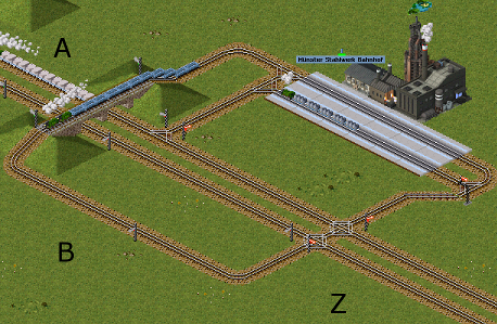 Das Stahlwerk im Bild wird von einem Erzbergwerk beliefert (Richtung Z). Vom Stahlwerk zum Erzbergwerk nimmt der Zug meistens den dafür gebauten Weg B, aber manchmal eben auch einen recht großen Umweg über A. Diese Linie besteht nur aus den 2 Haltestellen.