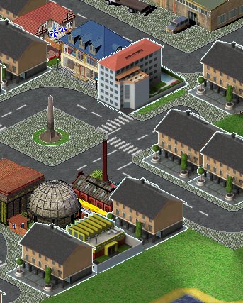 Die drei Gebäude habe ich testweise eingesetzt und freue mich schon auf die endgültige Version. In der jetzigen Fassung zeigen sie eine Art Leuchtkranz (s. Screens). Das Hotel ragt, wenn man es auf die 128-er Größe skaliert, über die üblichen Kachelmaße hinaus. Leider kann man die Grafik auch nicht einfach zuschneiden, dann fehlen Dachflächen und ein schmaler Gebäudeteil.