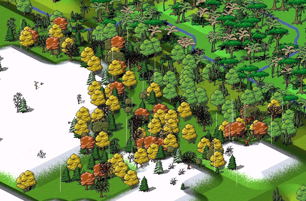 Starte Simutrans mit dem pak96.comic, klicke den Splashscreen weg. Kein Spiel laden oder starten, sondern den "neue Welt" Dialog schliessen. Das Datum zeigt 1960 an, ins Jahr 1985 vorgehen. Den Wald westlich von Stadtleben ansteuern. Jetzt den schnellen Vorlauf aktivieren. Mitte August sind die LInien auf dem Plateau an 19 September dann auch im tiefergelegenen Wald.