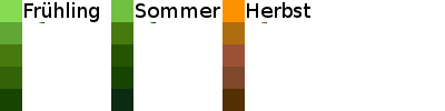 Wen es interessiert: meine Vorgehensweise ist es erst den Umriss zu malen. Danach wird der Umriss mit zwei Hintergrundfarben für die normale und die Schattenfläche gefüllt (die 2te und 4te Farbe auf dem Bild oben). Dann wird erstmal relativ willkürlich mit den anderen Farben auf den hellen und dunklen Bereichen gemalt. Je nachdem wo, wird eine andere Farbe gewählt. Zum Schluss schaue ich mir das Bild in Originalgröße an und entferne störende Stellen (meistens zu helle/dunkle Farben an unpassenden Bereichen) aus dem Bild. Die anderen Jahreszeiten entstehen durch Reihenweises um färben der Grüntöne.