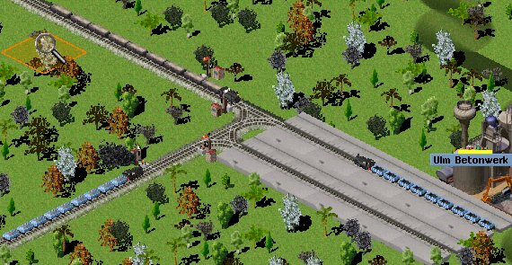 Der Sand wurde soeben entladen, wartet auf Ausfahrt. Zement und Steine kommen gerade. Jeweils am ankommenden Gleis steht ein Auswahlsignal.