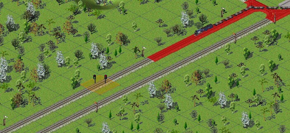 Der letzte Block auf der Steinstrecke ist länger als auf der Zementstrecke. Dadurch fährt der Steinzug zuerst am letzten "Signal" vorbei, und reserviert sich zuerst den nächsten Block, sofern dieser frei ist.