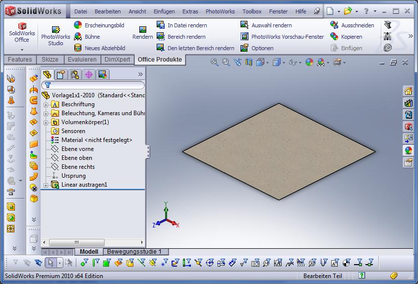 Photoworks wird nicht gleich bei jedem SWX-Start mitgestartet. Also müssen wir erstmal dafür sorgen, dass das Ding läuft. Im Befehlsmanager gibt es den Reiter „Office Produkte“ – wird dieser ausgewählt erscheint ganz links ein Button „Solidworks Office“. Wird dieser gedrückt erscheint unten eine Liste mit allen möglichen mehr oder weniger nützlichen Zusatzprogrammen unter denen auch Photoworks zu finden ist. Dieses einfach anklicken – einen Moment warten – und sich dann drüber freuen, dass neue Buttons im Befehlsmanager erscheinen