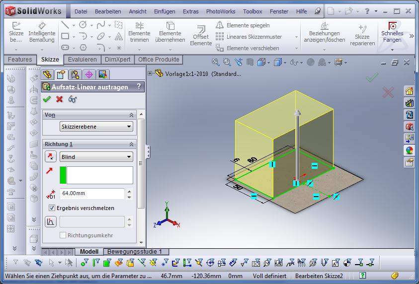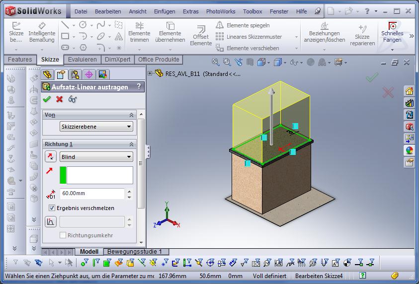 Also wieder auf Lineare Austragung, als Fläche für die Skizze verwenden wir nun die Oberseite des Quaders, Normal ausrichten.